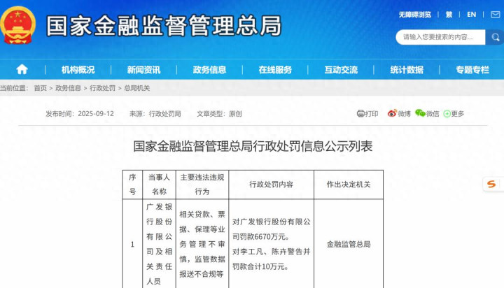 信息显示:广发银行相关贷款、票据、保理等业务管理不审慎,监管数据报送不合规等,对广发银行股份有限公司罚款6670万元,对相关责任人对李**、陈*警告并罚款合计10万元。