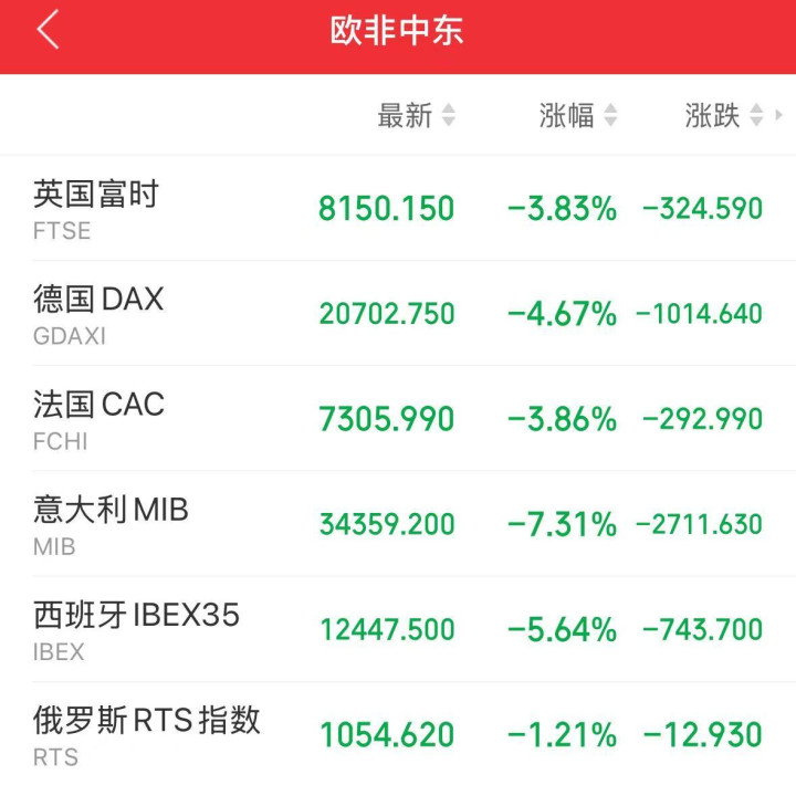 欧洲股市方面,欧股快速下挫,德国DAX指数日内暴跌近5.00%,法国CAC40指数大跌3.86%,英国富时指数大跌3.83%,意大利富时MIB指数重挫超7%,西班牙IBEX35指数跌近6%。