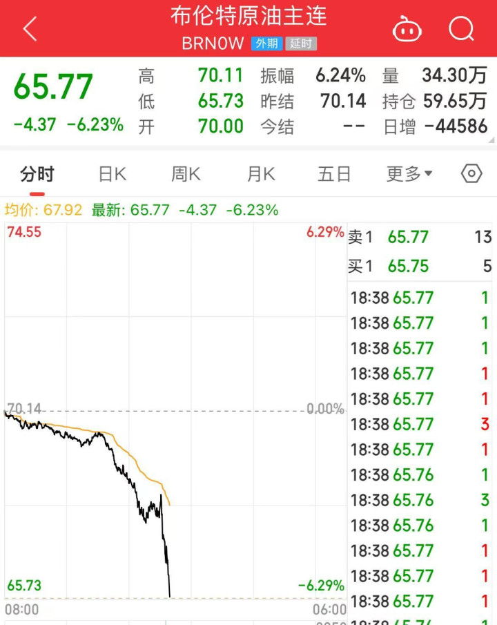 国际原油价格跳水,布油跌超6%,美油下跌5.75%。